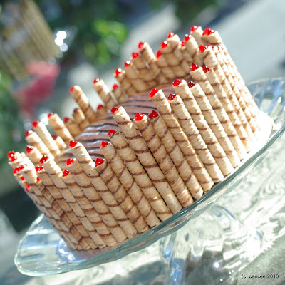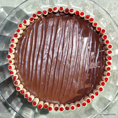 To surround the cake with the Pirouettes, you may want to trim them to to varying lengths as in pictures, using a small serrated knife. Repair any broken ones using ganache and press them gently against the sides of the cake. The ganache will hold them in place. If the ganache becomes too firm, heat it by applying a spatula run under hot tap water and dried.